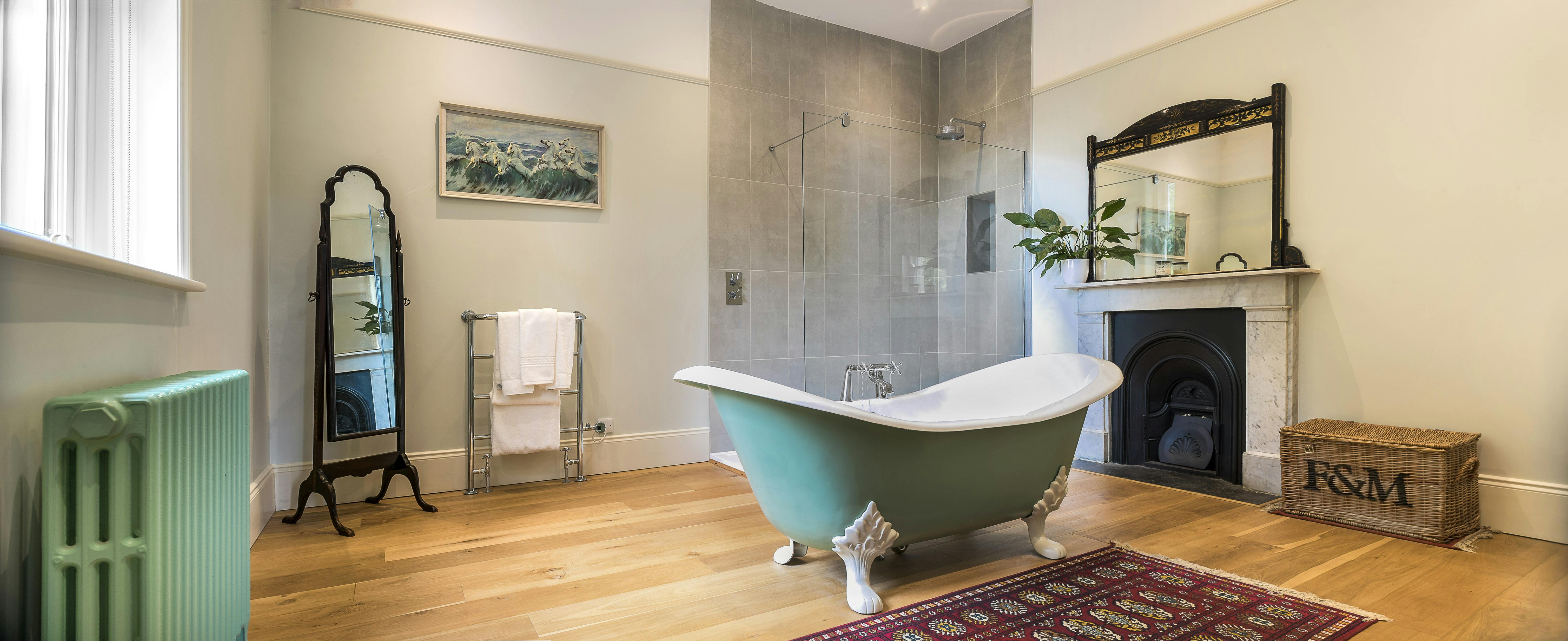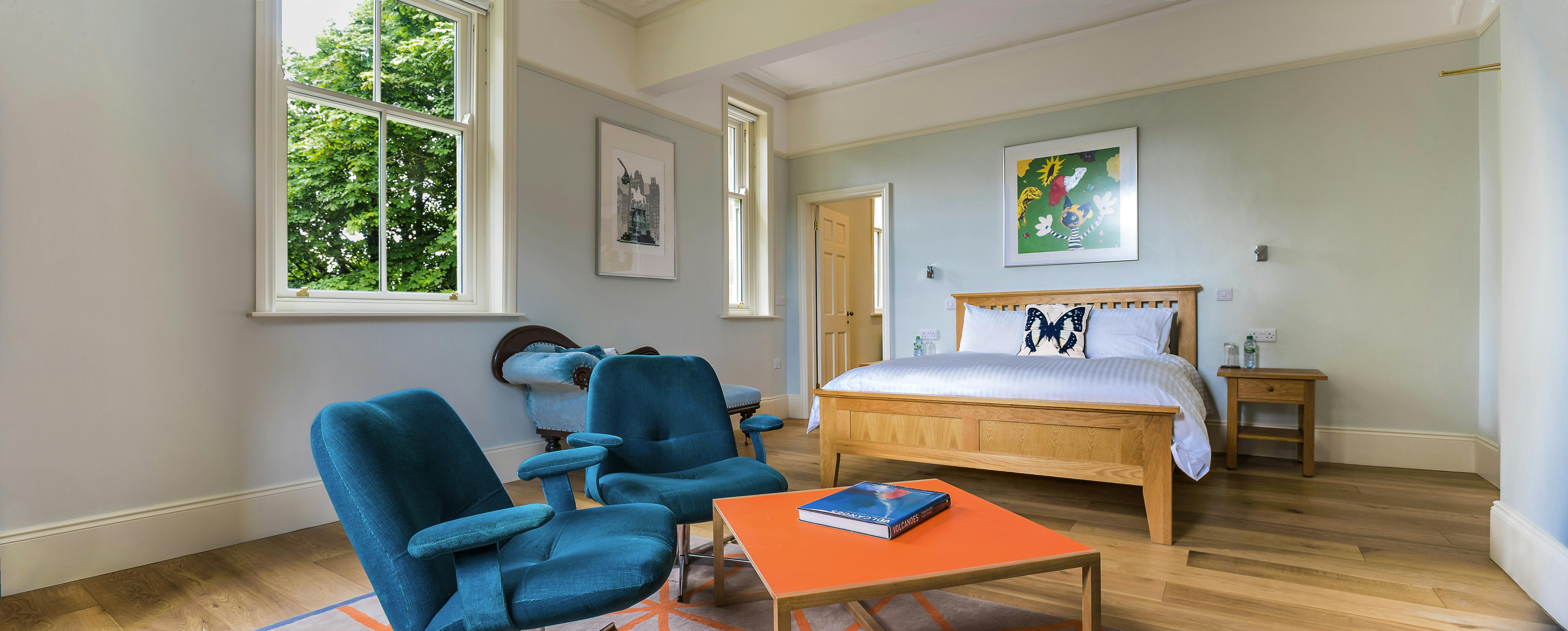 A large room with a king-size bed on the first floor with great views out over Penhill. There is a simply enormous bathroom with two basins, a beautiful cast iron bath and luxurious walk-in shower. On the wall are two prints by the British artist Dan Baldwin. Dogs allowed.